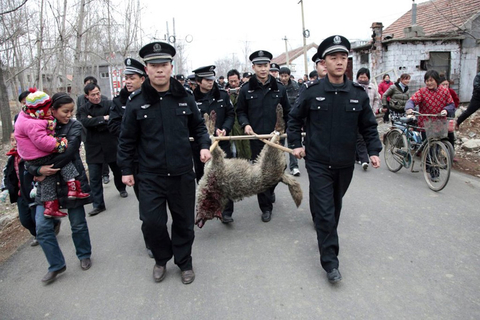 05 3月19日,山东枣庄滕州市柴胡店镇,民警抬着被打死的灰狼。 高翔 谢经岭/东方IC