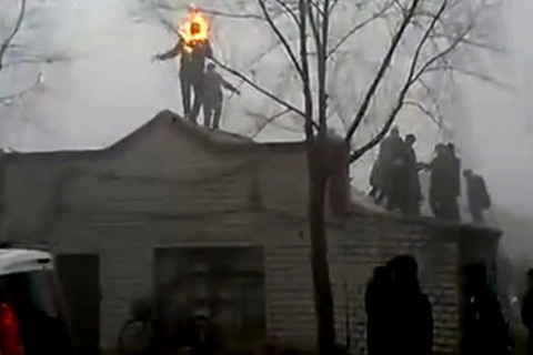 01 截屏图:2010年10月30日9时许,黑龙江省密山市一个年近七十的老汉因抵制强迁,在自家房顶点燃了汽油。 东方IC