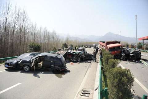 05 3月31日,车祸现场一片凌乱,迎亲车队的车辆被撞得四零八落。 CFP