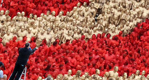 6月23日,德国城市慕尼黑市中心上演了一场艺术表演。千余名裸体志愿者从头到脚被喷上红色或金色的油漆,并根据现场的指令作出了一系列整齐的艺术形象表演。再现了德国歌剧艺术家威廉·瓦格纳的《尼伯龙根的指环》中的场景。这个壮观场面是美国摄影师斯宾塞·图尼克一手设计的,这也将成为他的最新艺术作品。