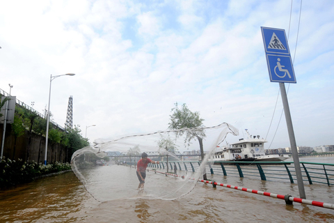 02 6月28日,柳州市民在被淹道路上撒网捕鱼。 新华社