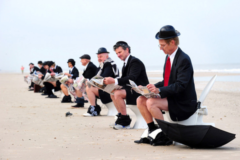 当地时间2012年8月18日,澳大利亚阿德莱德沙滩上,12名衣冠楚楚的抗议者将自带的坐便器排成一排,然后集体脱掉裤子坐在马桶上,并做出“如厕”的样子,每人手中还拿着一张报纸,他们通过此举抗议当地厕所太少,如厕困难。这些抗议者表示,当地没有一个公共厕所,所以出现“内急”时,他们通常不得不使用附近咖啡店的厕所,这既打扰了店里的顾客,也为店主带来不便。