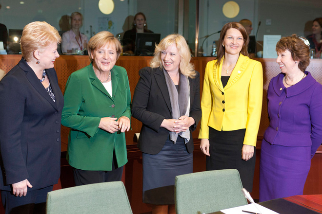 2010年9月16日,比利时首都布鲁塞尔,欧盟五位女领导人立陶宛总统格里包斯凯特、德国总理默克尔、斯洛伐克总理拉迪乔娃、芬兰总理基维涅米和欧盟负责外交与安全事务的高级代表阿什顿(从左至右)一起合影。 CFP