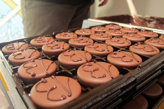 当地时间2012年9月13日,比利时布鲁塞尔,制作好的巧克力。 Miriam Schmidt/东方IC