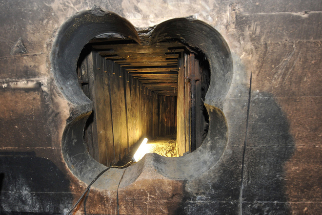 1月14日,德国柏林的一家银行金库惨遭失窃,盗贼从邻近银行的一个地下停车库开始,穿过两道坚固的钢筋混凝土墙,挖了一条30米长的隧道,将银行保险库洗劫一空后顺利逃走。图为一道厚达30厘米的混凝土墙壁。 东方IC