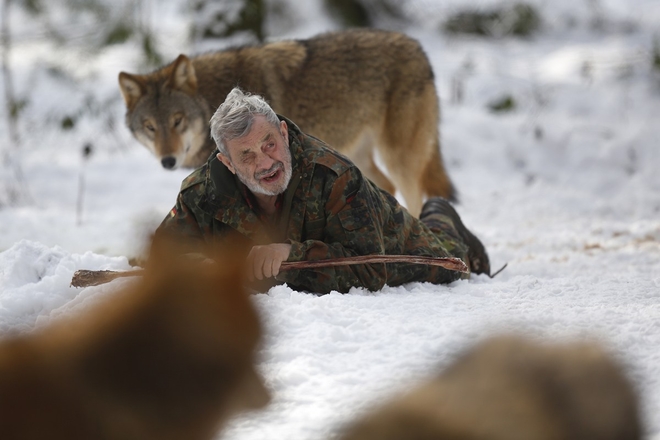 德国萨尔州,前德军伞兵、79岁的维尔纳・弗罗因德堪称不折不扣的“狼人”,他1972年创建了一个狼群保护地带,自那时起,他共饲养过70余只各种品种的狼,目前这个保护区共有29只狼。为了在狼群中立威,维尔纳行为上模仿雄性狼,坚持有肉自己先吃,然后才允许狼吃,以此得到狼群的尊重。