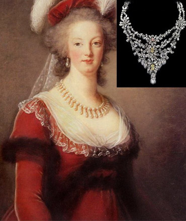 1.玛丽-安托瓦妮特的项链 价值:3700万美元:她是奥地利皇帝弗朗西斯一世和王后Maria Theresa的第十五个孩子。这串耀眼的项链由无数的白色钻石以及两粒十分罕见的椭圆形黄钻(重为5.24克拉)镶嵌而成,在项链最上方则坠着一颗美妙绝伦的粉钻,所有钻石都被完美地镶嵌在白金底座中,总重量为8.05克拉。另外,项链底端还有一颗白色的梨形钻石如水滴般垂下,重量为7.06克拉。
