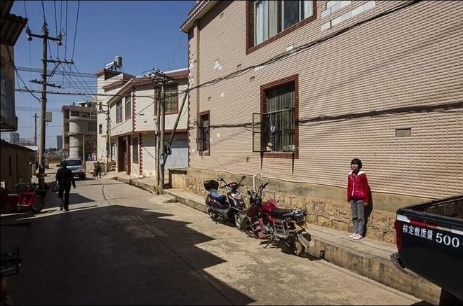 呈贡的一个村落,一名小姑娘靠墙而立。