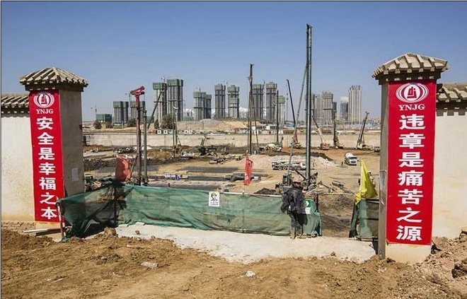 呈贡的一个建筑工地,红底白字的安全生产宣传标语非常醒目。