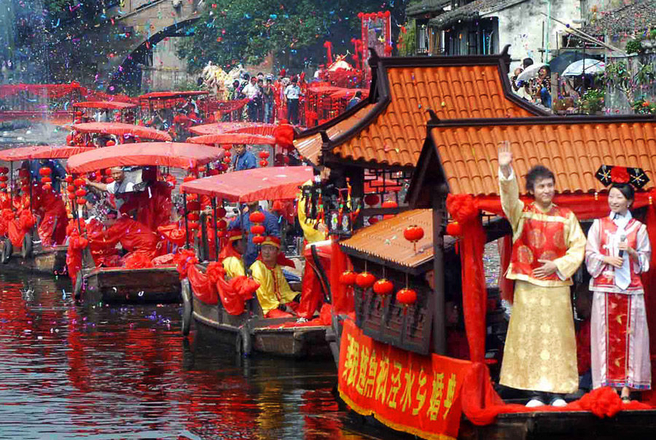 2007年9月28日,上海枫泾,20对新人举行了传统的中式婚礼,迎亲的车队改成了渡船。