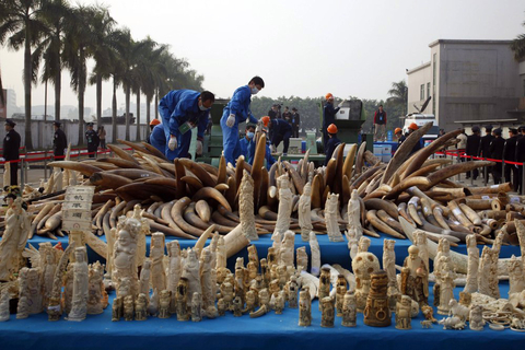 【财新网】(记者 刘虹桥)1月6日下午,国家林业局和海关总署在广东省东莞市联合销毁执法查没的6.1吨象牙及虎豹皮制品等野生动物产品。