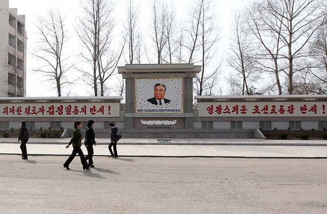 罗先市街道两侧挂有很多标语、宣传画和领袖画像,几乎随处可见,这也是朝鲜所有城市的特点之一。