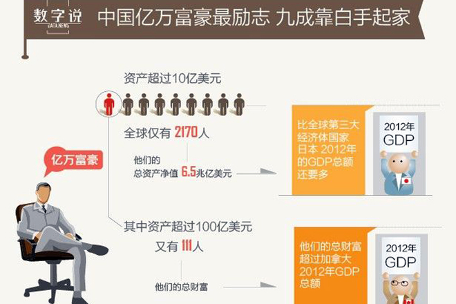 【中国亿万富豪六成白手起家】 中国亿万富豪白手起家比例全球最高,主要原因是因为改革开放政策提出后,才允许私有制的产生。而亿万富豪也随运而生。尽管高达60%的白手起家率,富二代却在中国风评较差。另一方面,中国亿万的主要收入来源为房地产,这也是大家对其诟病的一个理由。