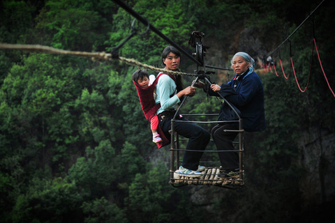 4月12日,贵州水城县,一家三代人赶集后坐溜索回家。贵州水城县营盘乡红德村的村民外出,无论男女老少,怕高还是不怕高,都要搭乘建在“乌蒙大裂缝”峡谷之上的溜索。村民们最大的希望是能有一座桥,让自己走出峡谷。 赵俊霞/CFP