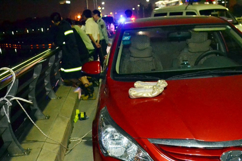 5月6日,江苏扬州,桥面上停放的跳湖者的红色轿车,车引擎盖上留有一双女式鞋子。 徐海风 孟德龙/东方IC