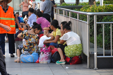 8月16日,等车的旅客依着栅栏席地而坐。 龙夫子/东方IC