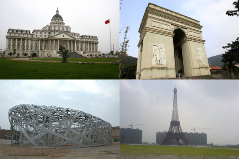 (拼图)左上分别为,酷似美国国会大厦的安徽阜阳颍泉区政府办公大楼,江苏华西村仿造的法国凯旋门。左下分别为,山寨鸟巢,杭州一座仿法国巴黎埃菲尔铁塔。