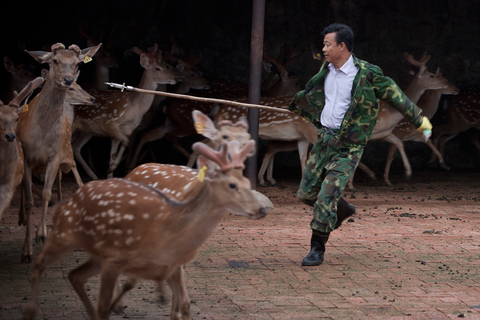 2012年7月27日,吉林省辽源市东丰县黄河镇某鹿厂,技师正在为麻醉的梅花鹿切割鹿茸。 徐晓林/CFP
