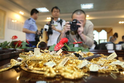 2014年5月16日,安徽省马鞍山市,当涂县“4.11”特大抢劫金店案赃物返还大会会场,民警在清点赃物。 张发平/CFP
