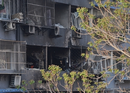 财新记者在现场看到,5号楼表面有大片烧焦、发黑痕迹,事发现场已被封锁线围住。有几栋楼房受损严重,警方阻止居民返回屋内。截止到晚22时,尚有大量居民在附近滞留。